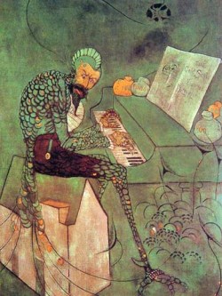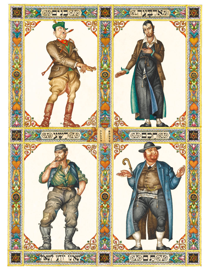 Here’s one that made me laugh. It’s an illustration of the four types of sons. Reading right to left (this is in Hebrew, remember), top to bottom, they are the wise son, the wicked son, the simple son, and the son who doesn’t know how to ask. What made me laugh right away is that the wicked son is portrayed as fat and wealthy, a self-satisfied bürger with a mustache somewhat reminiscent of Hitler’s. (Probably intentionally — see the next paragraph.) But on a further look, it’s also pretty funny that the most attractive and interesting of the four isn’t the wise son — who looks a bit of a prig, to me at least — but the son who doesn’t know how to ask. Am I just projecting my own issues onto the painting, or was Szyk most sympathetic to the fourth son?